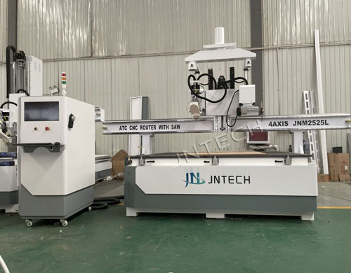 –JNM2525L 4Axis CNC Router with Saw Blade Multi-angle cutting for solid wood cutting, furniture cutting, saw blade can cut fast.